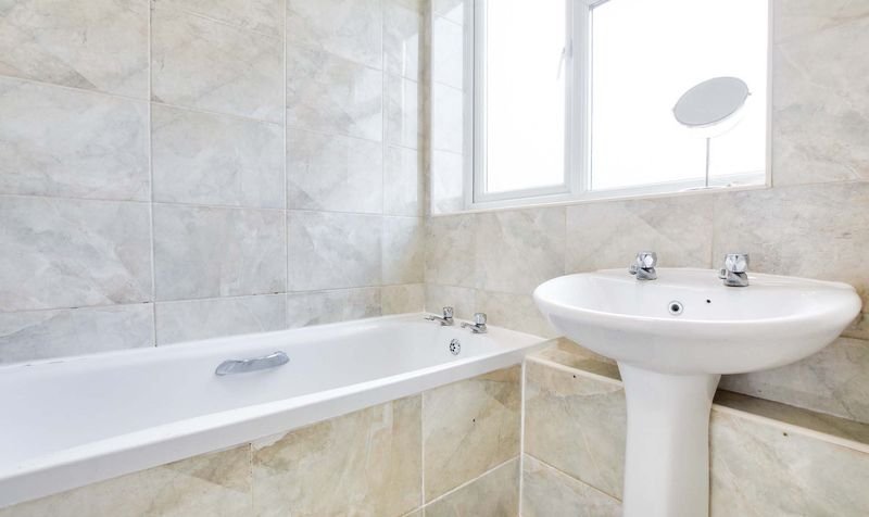 With a double-glazed window to the front elevation, bath with shower over, wash hand basin, tiled walls and a radiator.