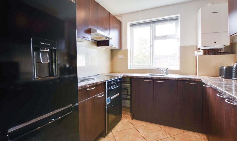 With a double-glazed window to the front elevation, ceramic tiled flooring, a range of wall and base units with work surfaces over, sink and drainer unit, tiled splashbacks, space for a free-standing oven and gas hob, space for a fridge freezer and a wall mounted boiler.