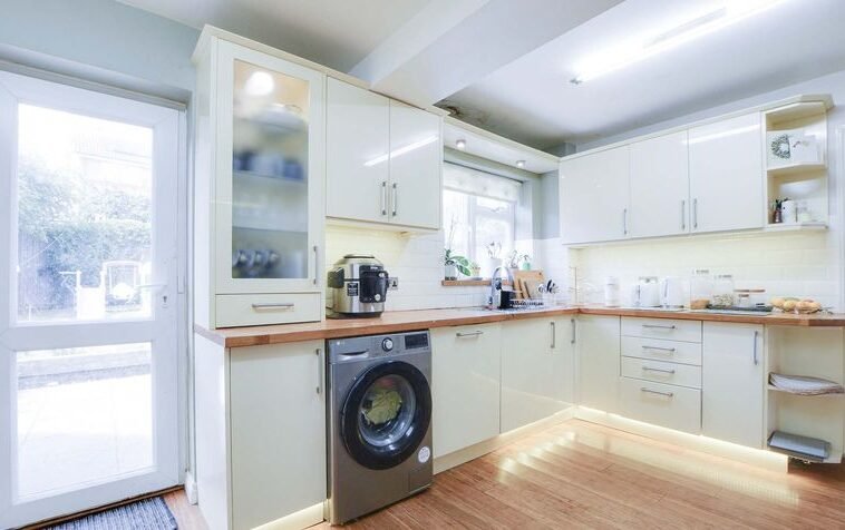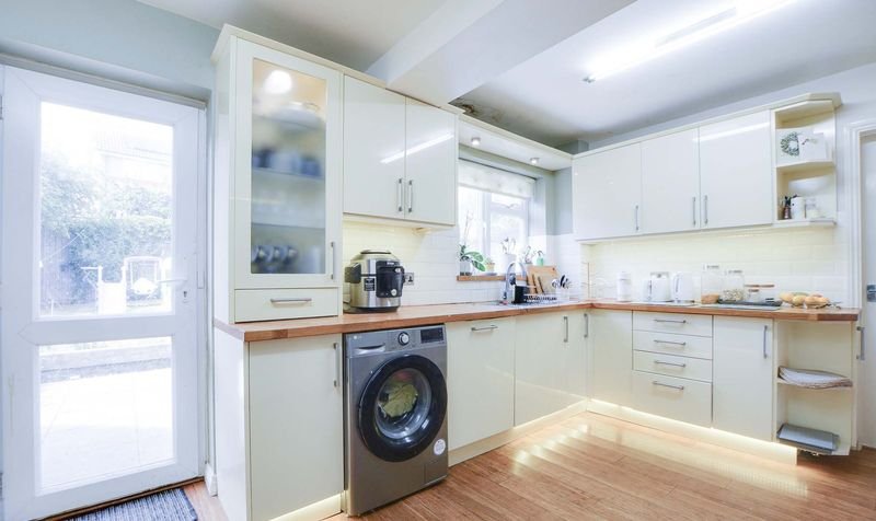 With double glazed window to the rear elevation, double glazed door to the rear garden, wood effect floor, a range of wall and base units with work surface over, stainless steel sink, drainer and mixer tap, part tiled walls, gas cooker point, extractor hood, glazed splash back, plumbing for washing machine, space for tall freestanding fridge freezer, door to garage.