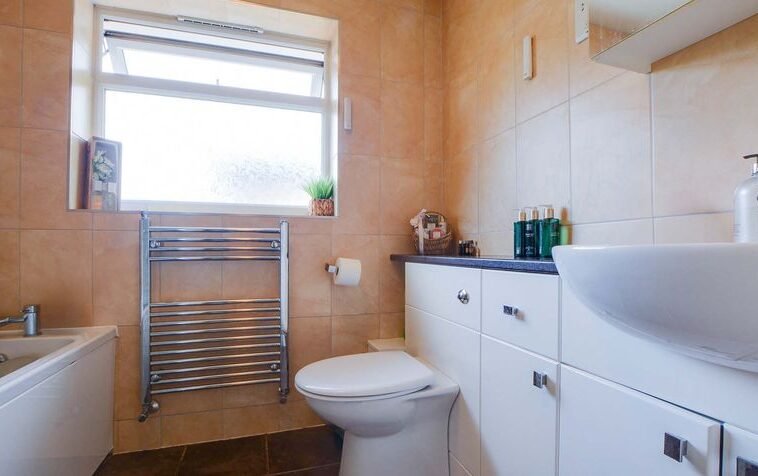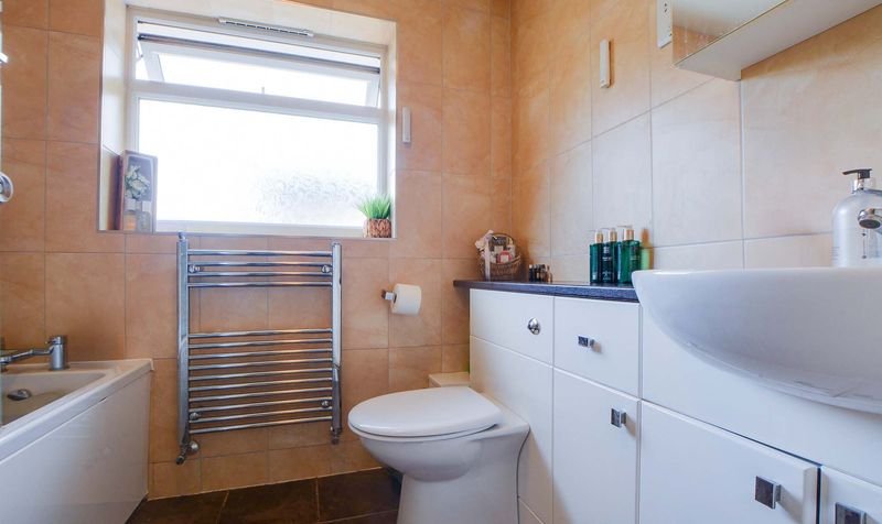 With double glazed window to the rear elevation, bath with shower over and shower screen, low-level WC, wash hand basin with storage below, tiled walls, chrome ladder towel rail/radiator.