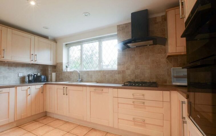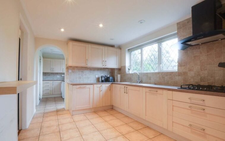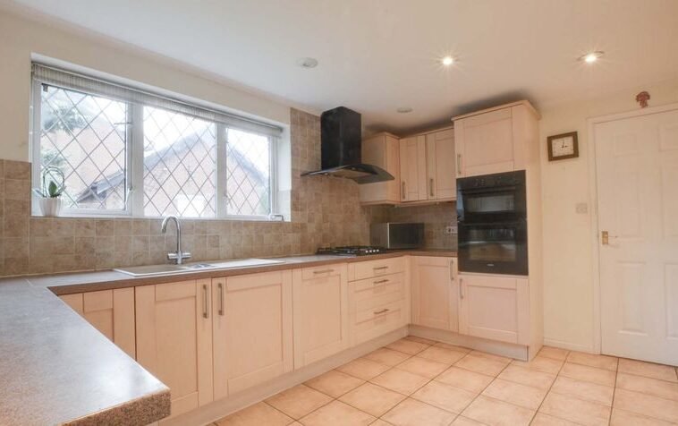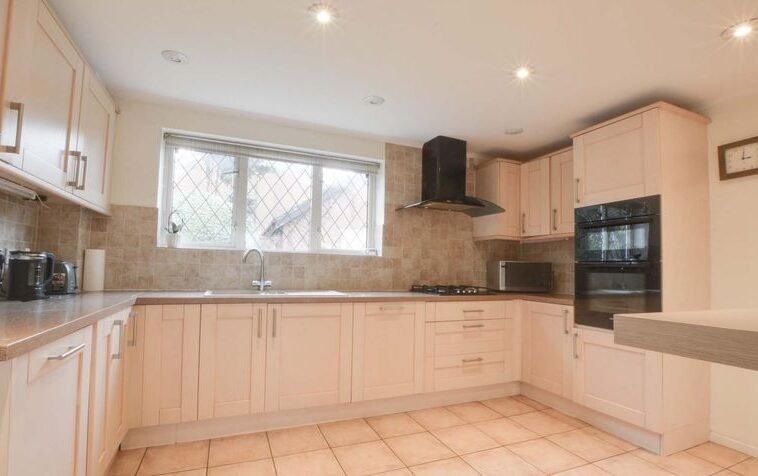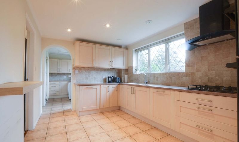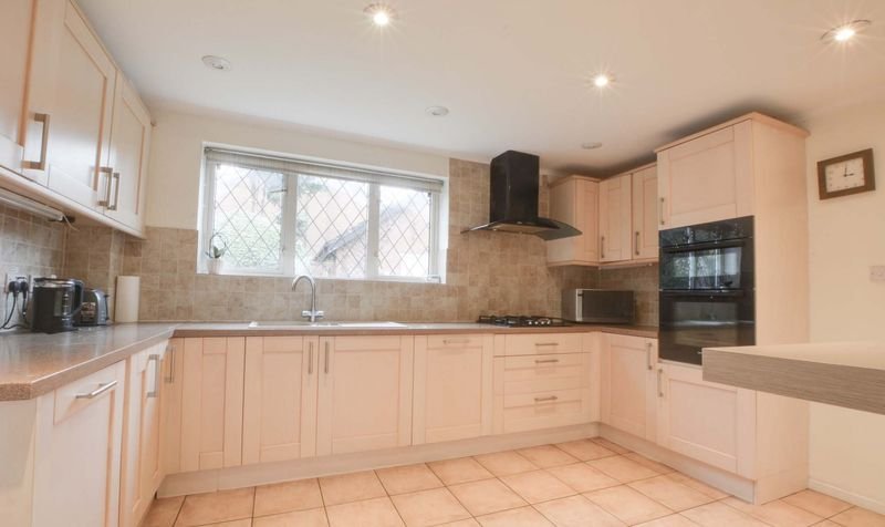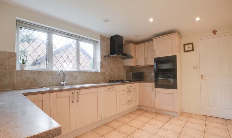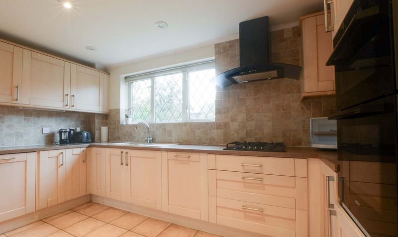 Having natural light coming through the double glazed window to rear elevation, a range of base and wall units accompanied by rolled edge Corian work surfaces incorporating a sink, drainer, and mixer tap, tiled splash backs, integrated appliances include an inset four-ring gas hob and double oven with extraction hood over, integrated dishwasher, spotlights, ceramic tiled flooring, and tall wall-mounted feature radiator.