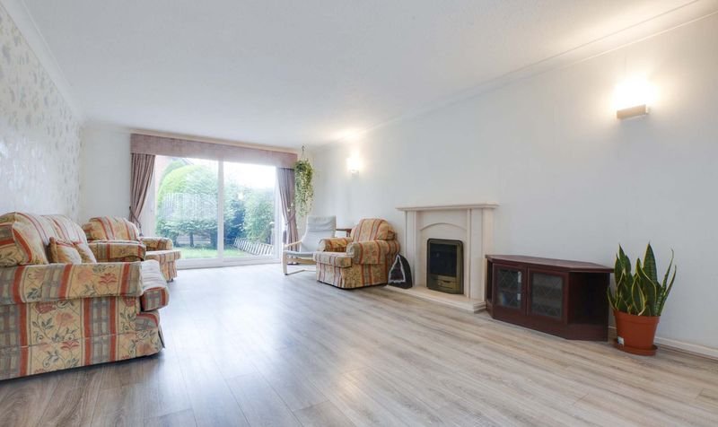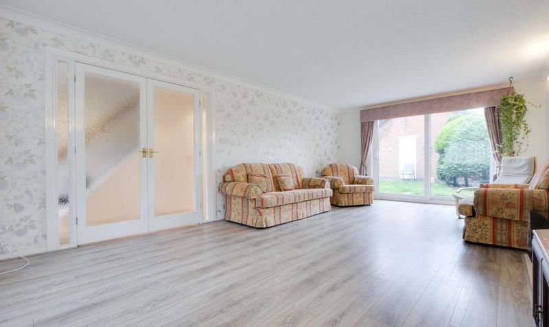 A light and airy living room entered via double doors and provides plenty of natural light coming through the double glazed window to front elevation, double glazed sliding patio doors providing views and access to the rear garden. There is coving to ceiling, a living flame gas fire with natural stone surround and hearth, TV point, and two radiators.