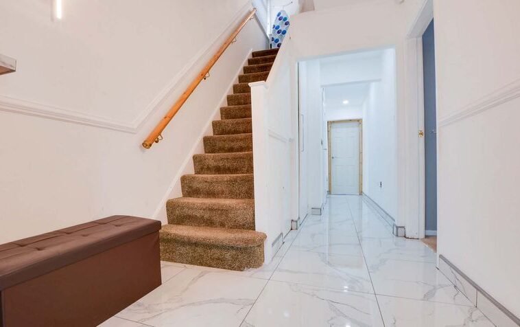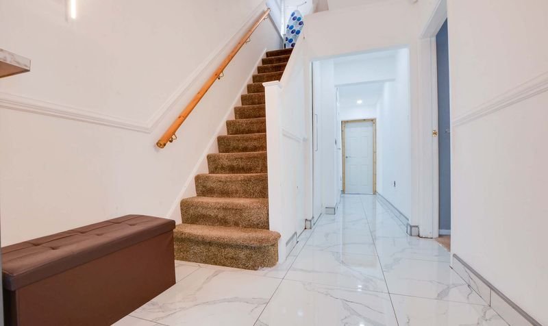 With double glazed door to the front elevation, double glazed door to the side elevation, marble tiled floor, stairs to first floor, under stairs storage cupboard, radiator.