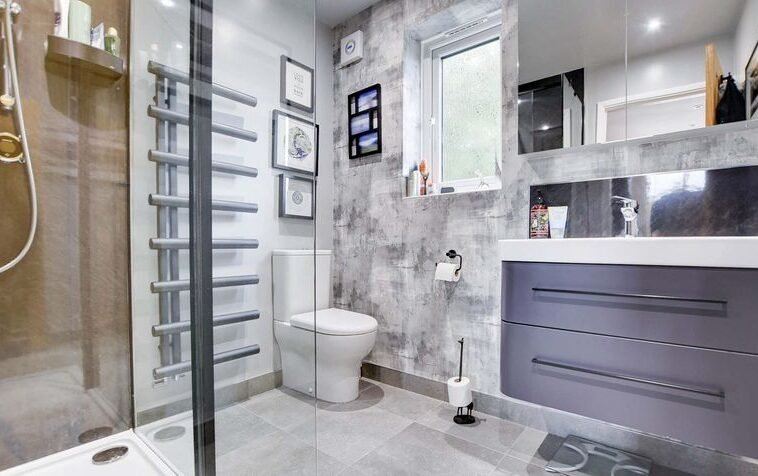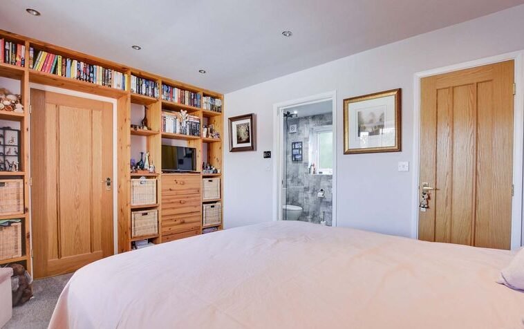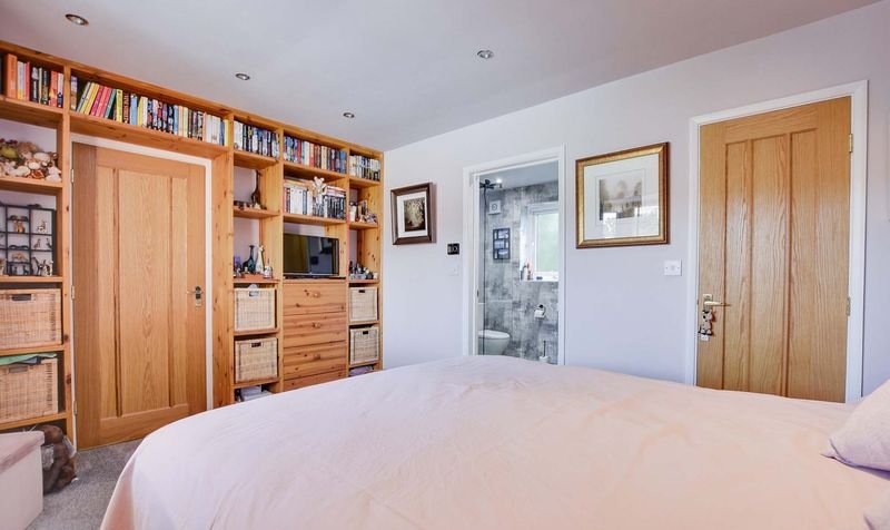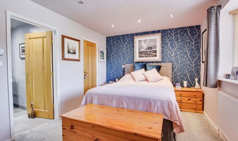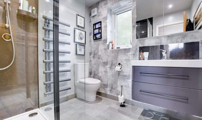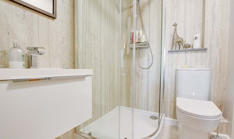 With double glazed window to the rear elevation, tiled floor, floating wash hand basin with storage below, medicine cabinet over, shower cubicle, low-level WC, under floor heating, ladder towel rail/radiator.