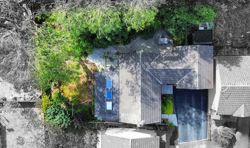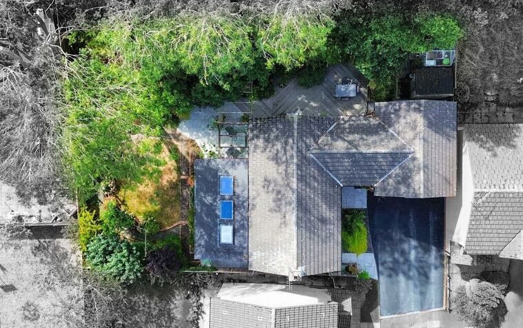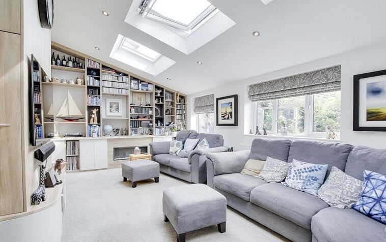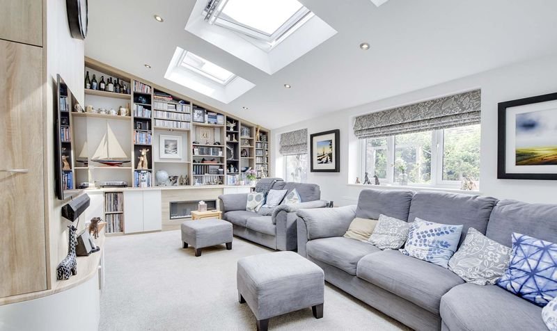 With a sloped roof having three skylights with one operating remotely, double glazed French doors and window to the rear elevation, three double glazed windows to the side elevation, fitted shelving, electric fire, fitted storage cupboards, radiator.