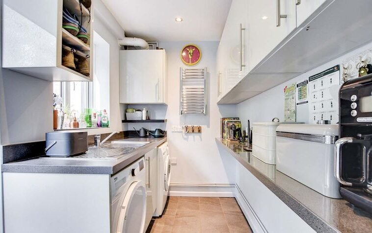 With double glazed window and door to the rear elevation, tiled floor, plumbing for washing machine, space for tumble dryer, wall and base units with work surface over, sink and drainer unit, cupboard housing boiler, ladder towel rail/radiator.