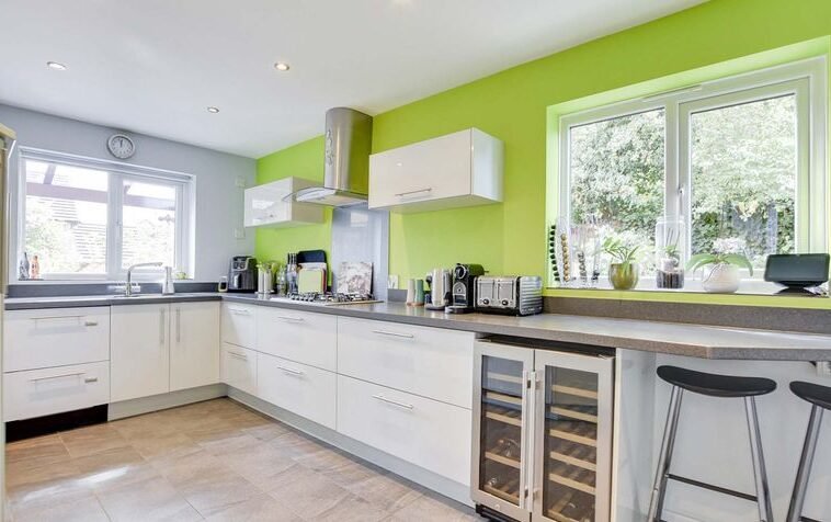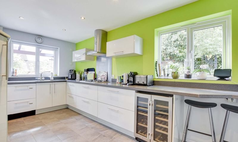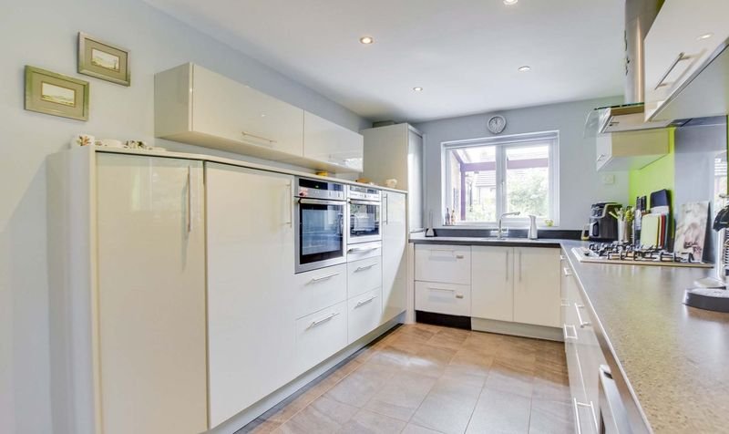 With double glazed windows to the rear and side elevations, tiled floor, wall and base units with work surface over, integrated oven, combination oven/microwave, warming drawer and hob, integrated fridge, integrated freezer, integrated wine cooler, integrated double drawer dishwasher, one and a half bowl sink and drainer unit, under floor heating, archway leading to utility room.