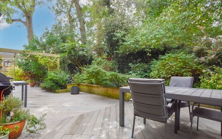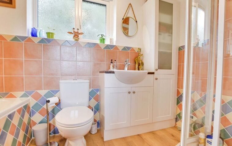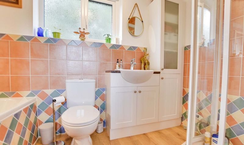 With double glazed window to the rear elevation, wooden floor, part tiled walls, bath, shower cubicle, wash hand basin with storage below, low-level WC, ladder towel rail/radiator.