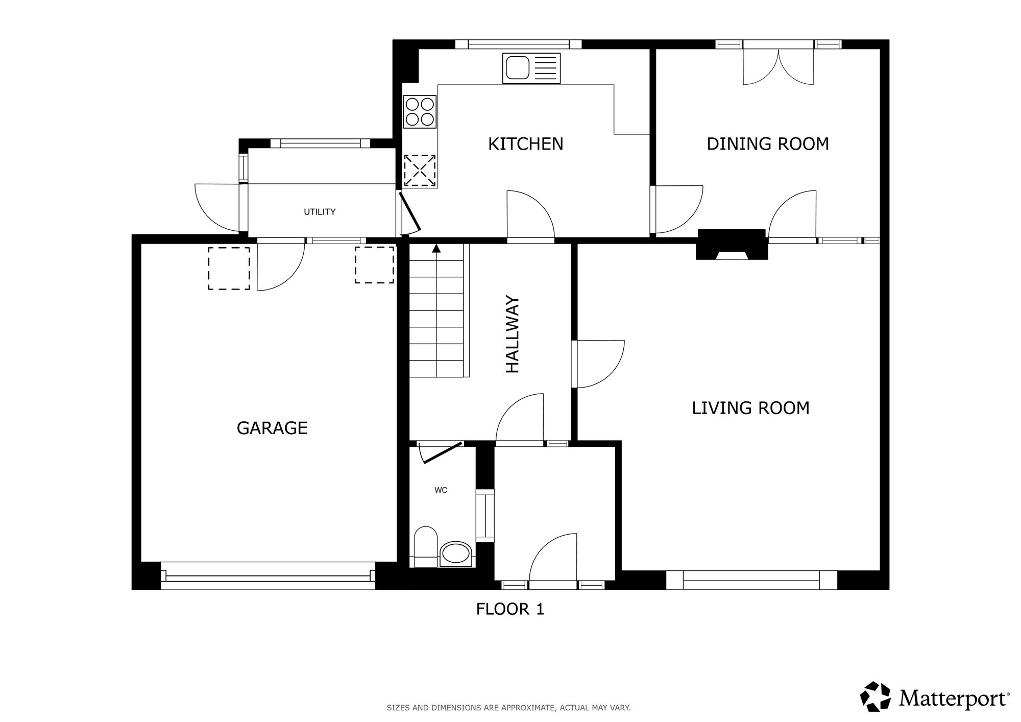The ground floor features an entrance porch and a welcoming hallway with herringbone-style Karndean flooring. The spacious living room includes an electric stone fireplace, while the dining room enjoys French doors opening onto the rear garden. A fitted kitchen with pantry and integrated appliances is complemented by a utility space providing access to the garage. A ground-floor WC completes the layout.