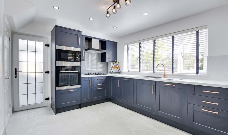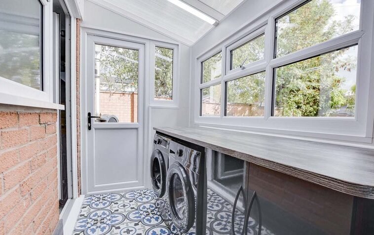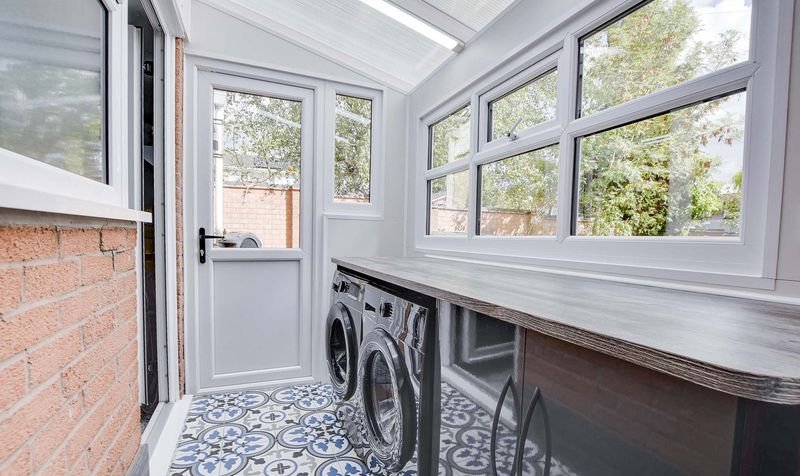 With a double-glazed window to the rear elevation, a double-glazed door to the side elevation, tiled flooring, a range of wall and base units with work surfaces over, plumbing for a washing machine, access to the garage.