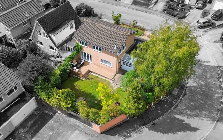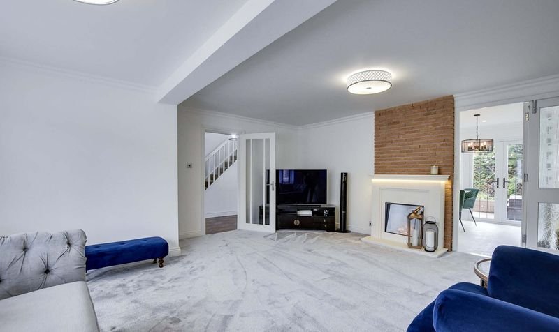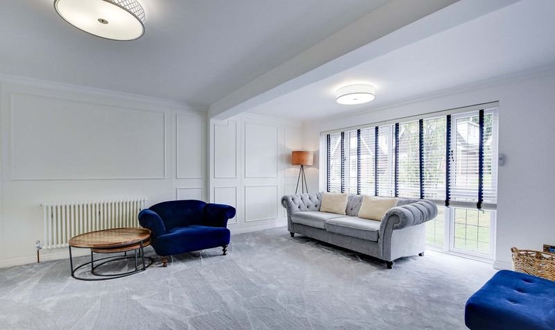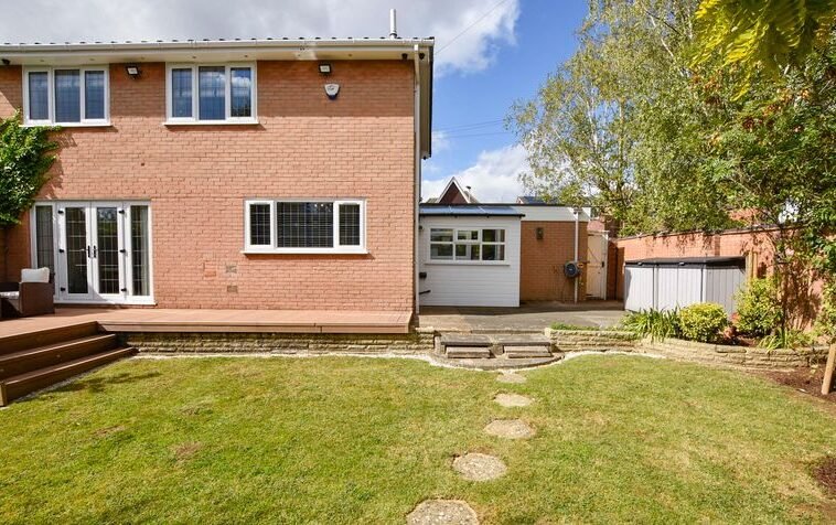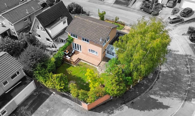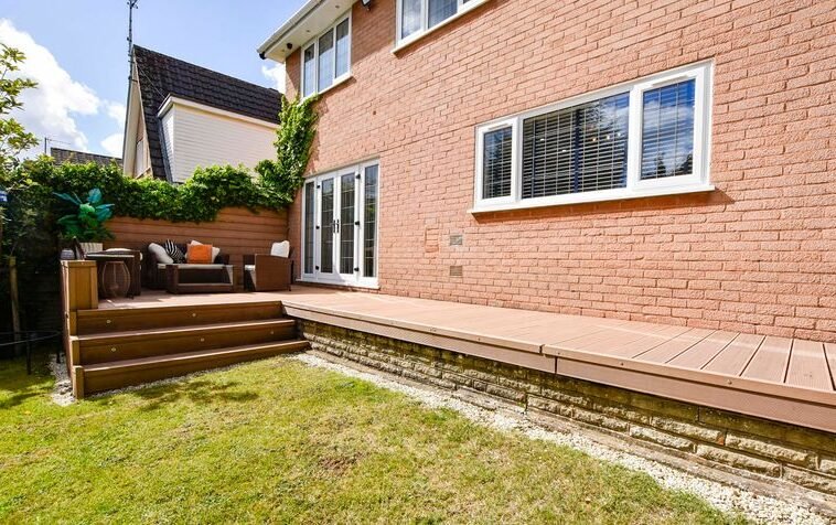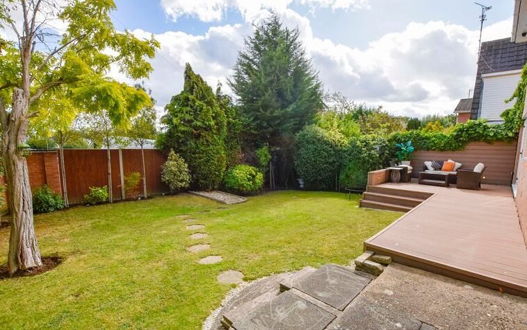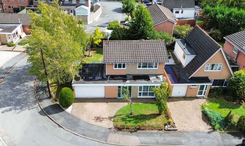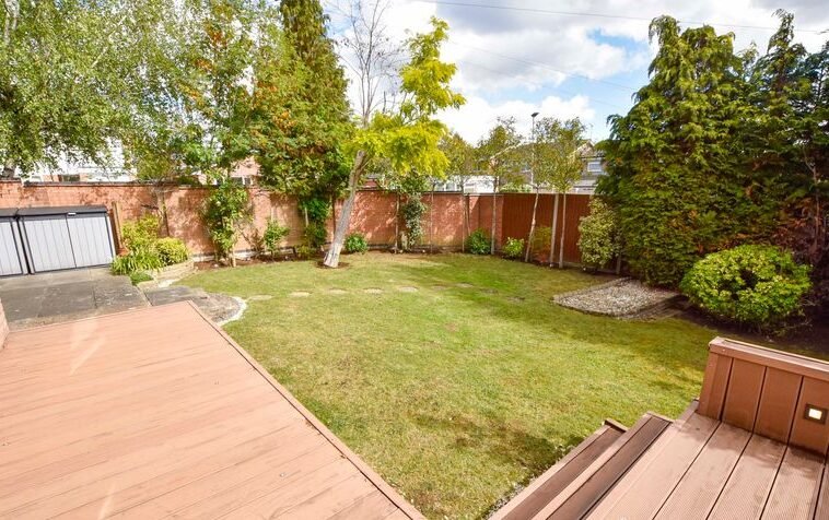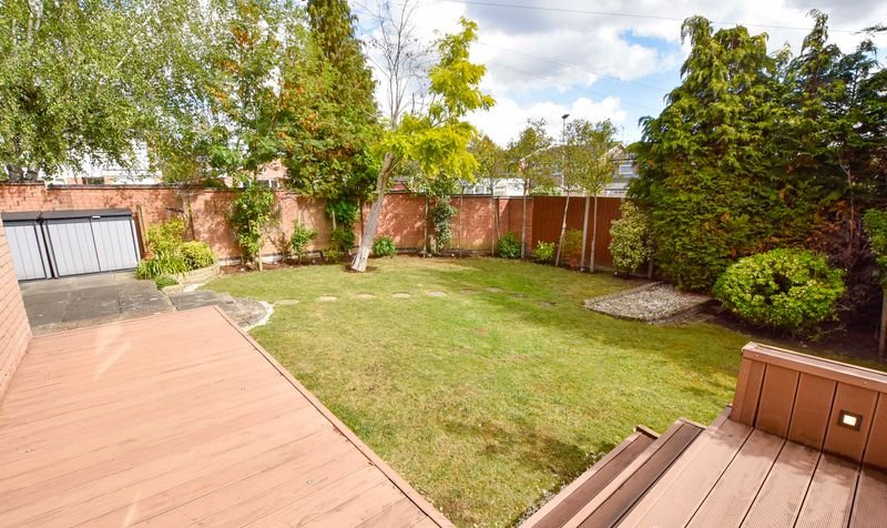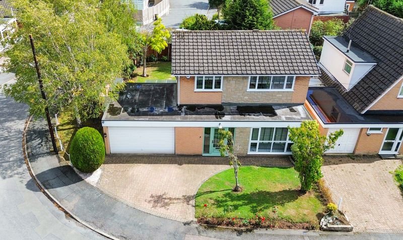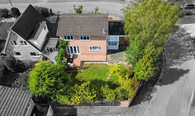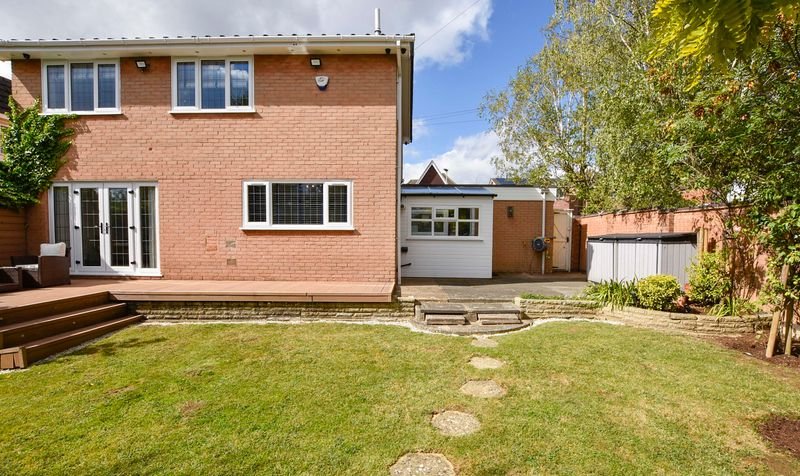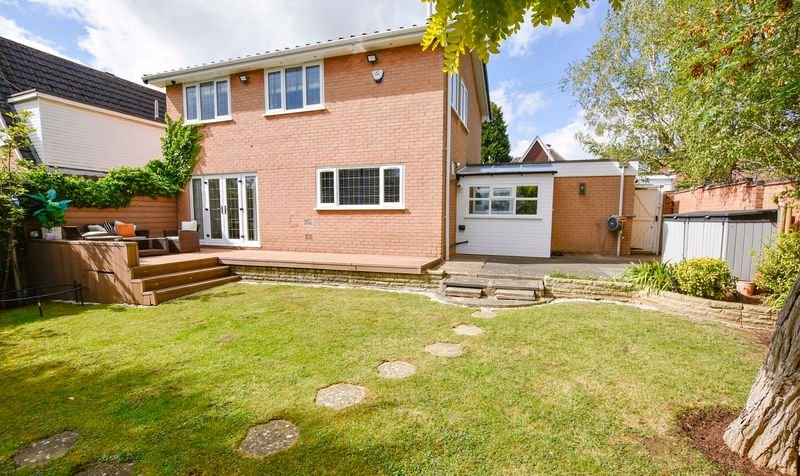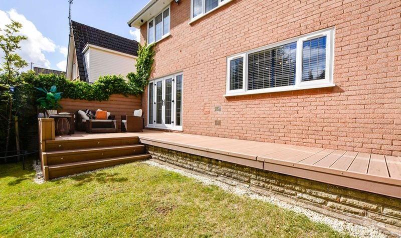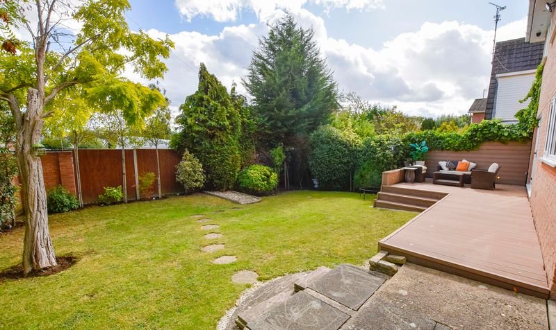 Externally, the property boasts a wrap-around rear garden with decking, lawn and patio seating area, together with a lawned frontage. Parking is provided by a driveway and a double garage with electric door.