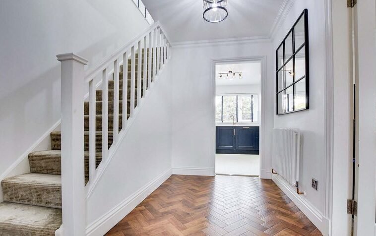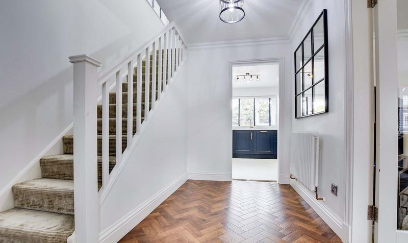 With Karndean flooring in a herringbone style, stairs to the first-floor landing, radiator.