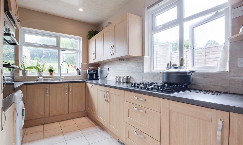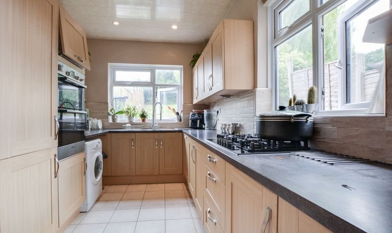 With double glazed windows to the rear and side elevations, double glazed door to the rear garden, ceramic tiled floor, part tiled walls, a range of wall and base units with work surface over, stainless steel sink and drainer unit, inset five ring gas hob, integrated double oven, integrated fridge, integrated freezer, plumbing for washing machine, spotlights.