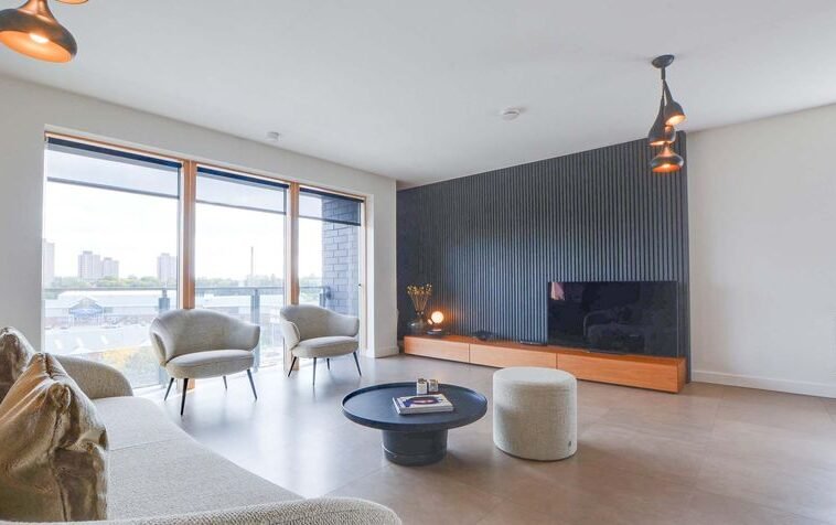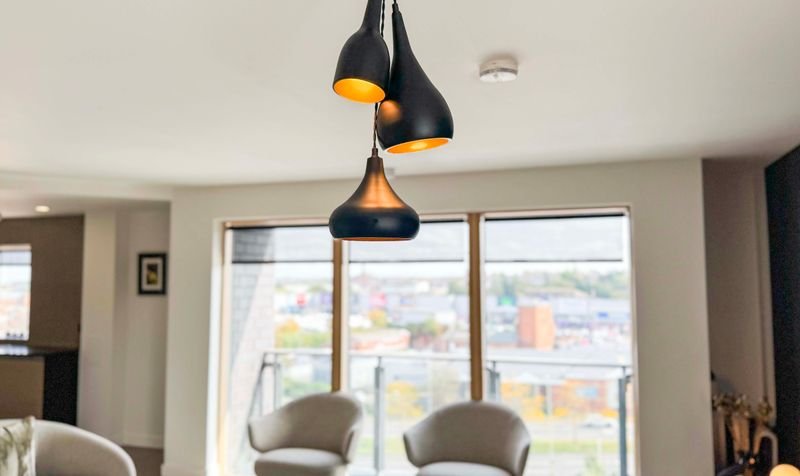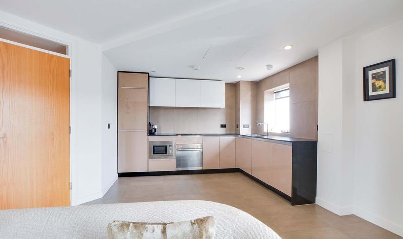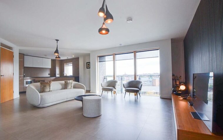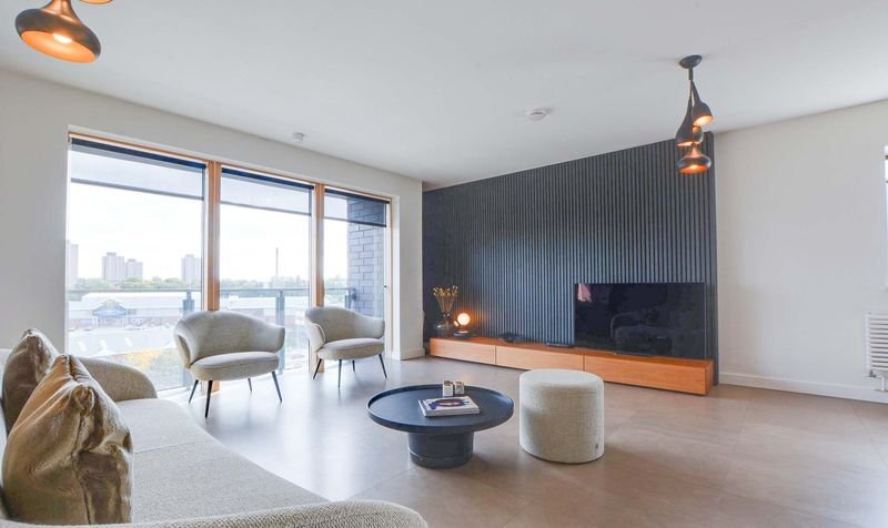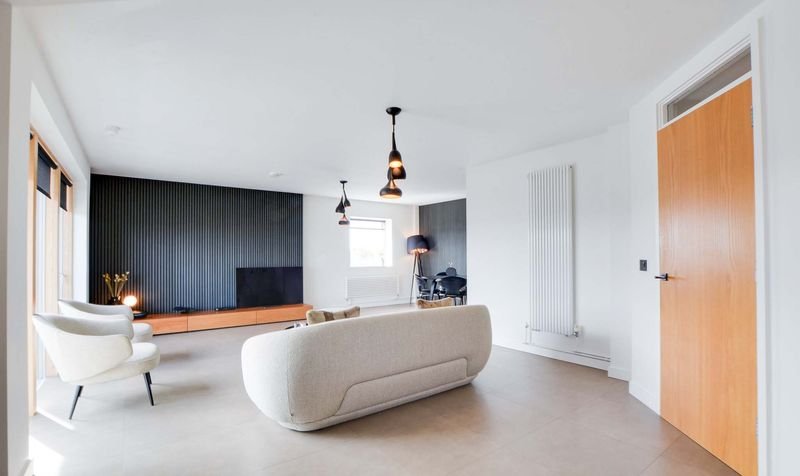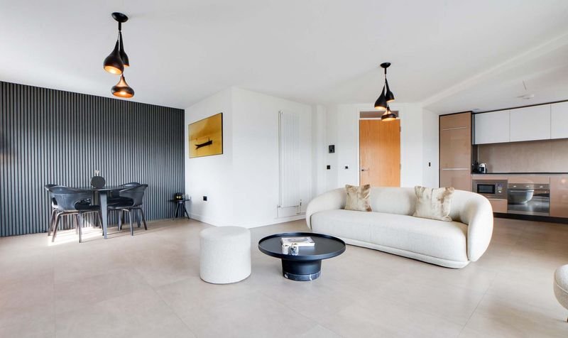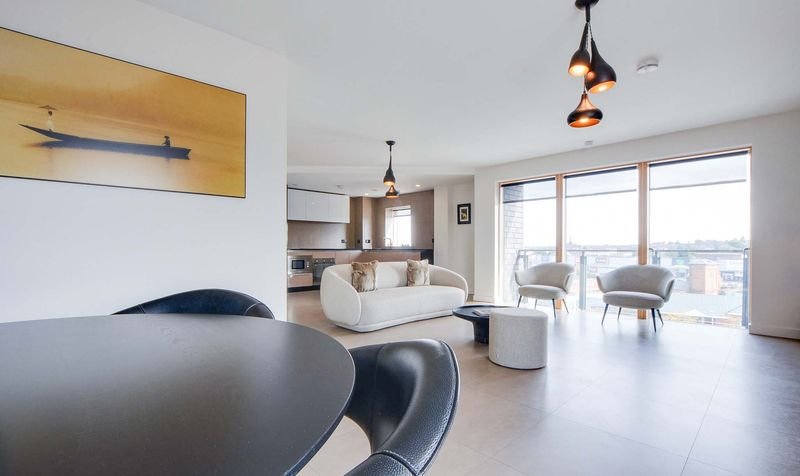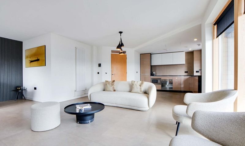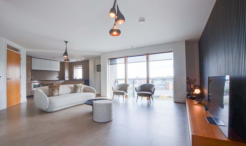 With Velfac double glazed windows and doors providing views over Leicester City centre, access to a balcony, leather effect tiled floor, TV point, feature drop down lighting, Acupanel feature walls, wall mounted radiator, open aspect to the kitchen area.
