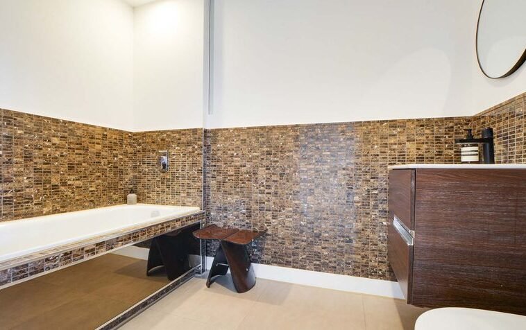 With leather effect tiled floor, part tiled walls, Roca suite including bath, low-level WC, vanity wash hand basin, extractor fan.