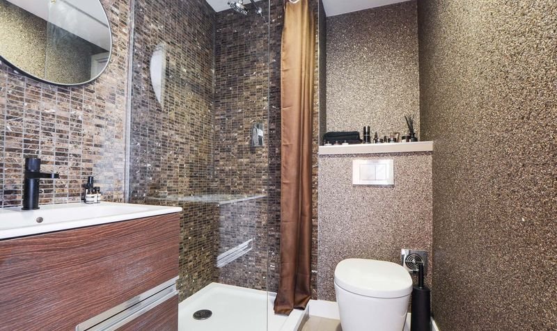 A stylish en-suite shower room with a Roca suite with leather effect tiled floor, shower cubicle, vanity wash hand basin, low-level WC, extractor fan, part tiled walls.
