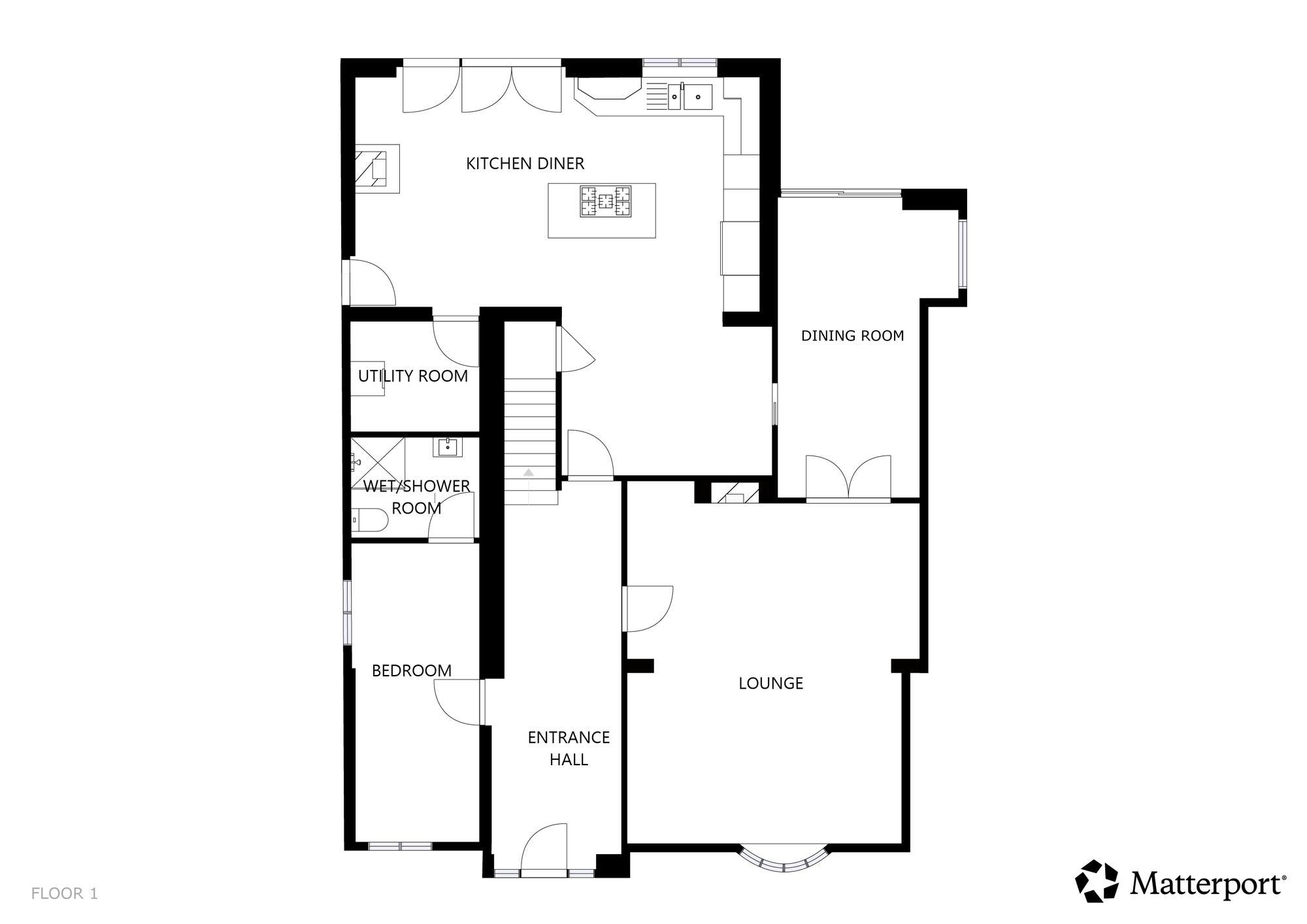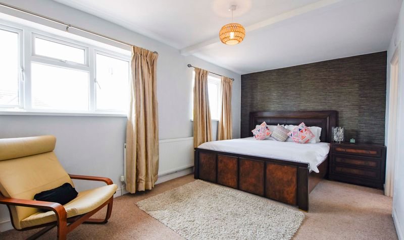 The ground floor features two reception rooms, an extended kitchen diner, utility room, and a fourth bedroom complete with an en-suite wet/shower room, ideal for guests or multi-generational living. To the first floor are three additional double bedrooms, including a principal bedroom with en-suite shower room, and a family bathroom.