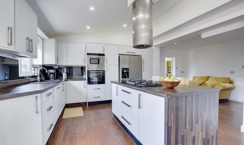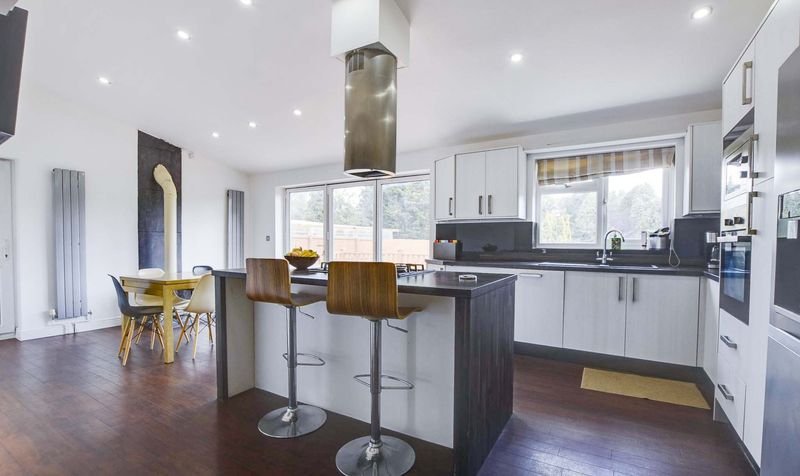 Measurement also 3.68 x 2.56 m. With double glazed bi-folding doors to the rear elevation, double glazed window to the rear, double glazed door to the side elevation, wood burner, laminate floor, wall and base units with work surface over, integrated oven, centre island with inset gas hob with filter hood over, integrated microwave, integrated dishwasher, one and a half bowl sink and drainer unit, pantry, three radiators.