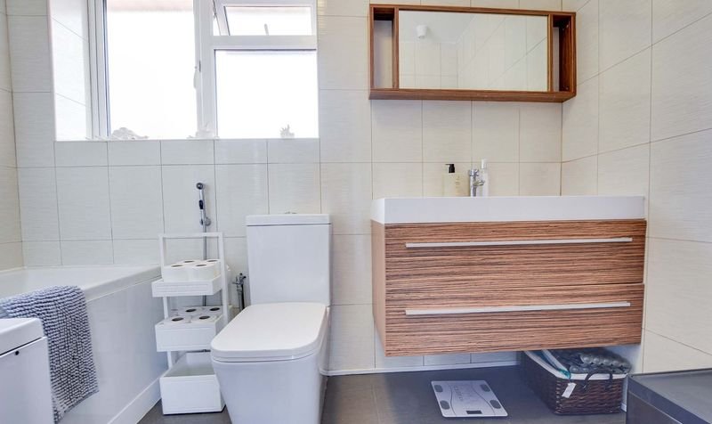 With double glazed window to the rear elevation, tiled floor, tiled walls, Jacuzzi bath with electric shower over, floating wash hand basin with storage below, low-level WC, wall mounted mirror, radiator.