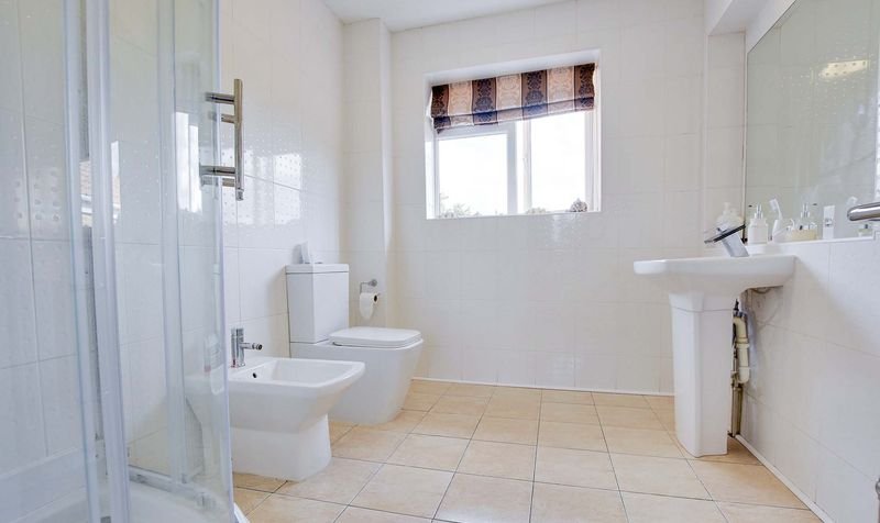 With double glazed window to the rear elevation, tiled floor, tiled walls, walk-in shower cubicle, low-level WC, bidet, wash hand basin, ladder towel rail/radiator.
