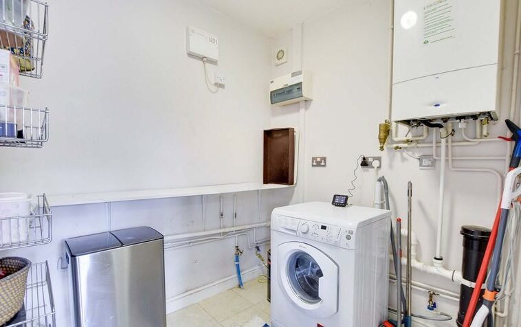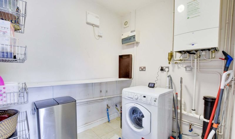 With tiled floor, boiler, fuse box, plumbing for washing machine.
