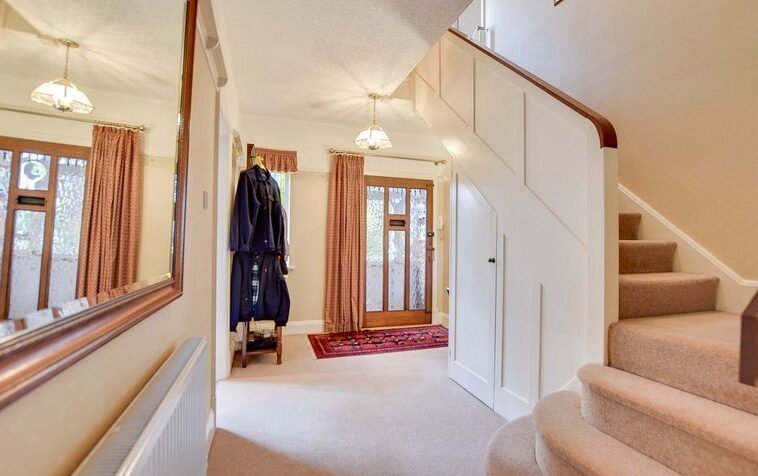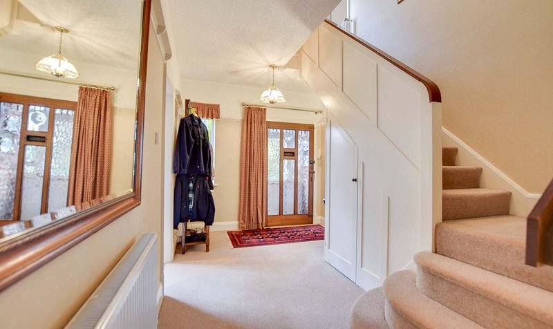 With stairs to first floor, under stairs storage cupboard, plate rack, radiator.