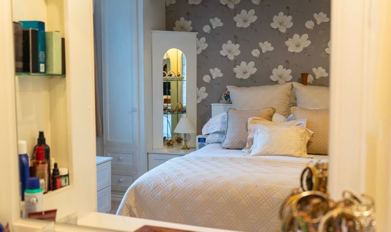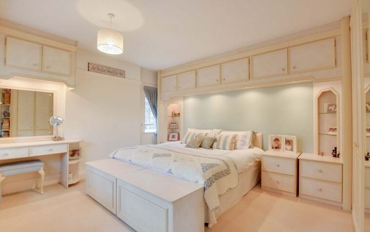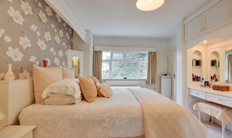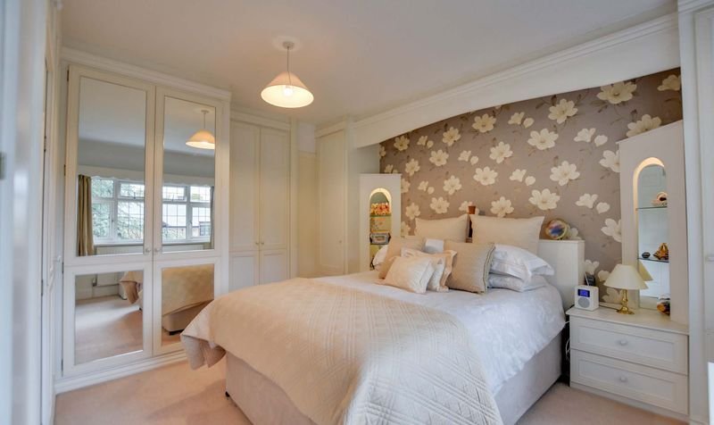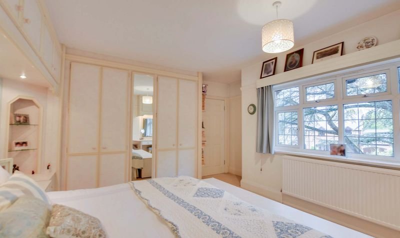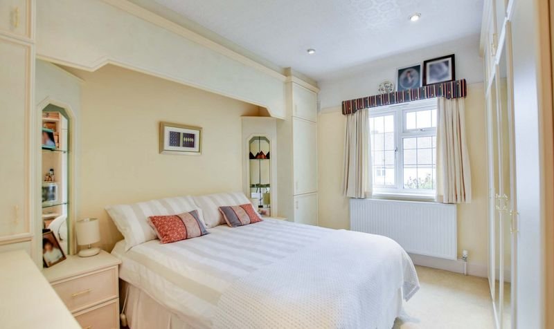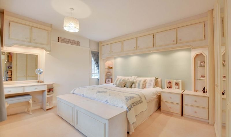 Measurement narrowing to 3.64 m. With double glazed windows to the front and side elevations, inset ceiling spotlights, a range of fitted wardrobes, mirrored wardrobes, box cupboards over, bookshelf, dressing table and drawers, radiator.