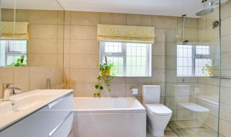 Measurement narrowing to 2.77 m. With double glazed window to the rear elevation, bath with mixer tap shower attachment, walk-in tiled shower cubicle with overhead rainforest shower and handheld shower, low-level WC, wash hand basin, tiled walls, tiled floor, inset ceiling spotlights, storage cupboard, extractor fan, heated towel rail.