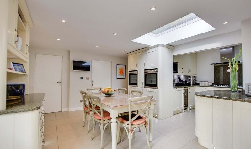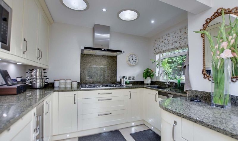 Measurement narrowing to 3.3 m. With double glazed window to the rear elevation, patio doors to the side elevation, skylight window, internal door to double garage, walk-in pantry with alarm box, CCTV monitor, built-in sink with granite drainer, wall units with under unit lighting, base units with granite work surface over, two built-in Neff ovens, built-in six ring gas hob with granite splashback and stainless steel chimney hood over, built-in Neff microwave, Samsung American fridge freezer with ice and water dispenser, wine cooler, further base units with granite work surface and display shelving and book shelf over, built-in lighting, built-in dishwasher, tube lighting, tiled floor with under floor heating, two radiators.