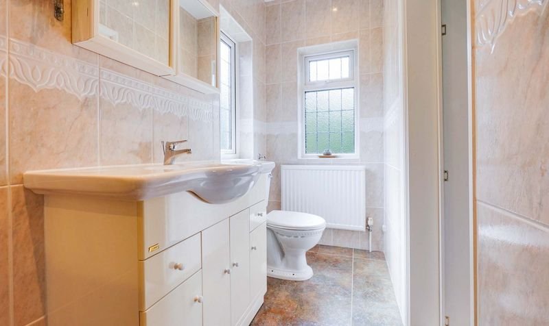 With double glazed windows to the rear and side elevations, walk-in tiled shower cubicle with overhead rainforest shower, low-level WC, wash hand basin, extractor fan, tiled walls, tiled floor, radiator.