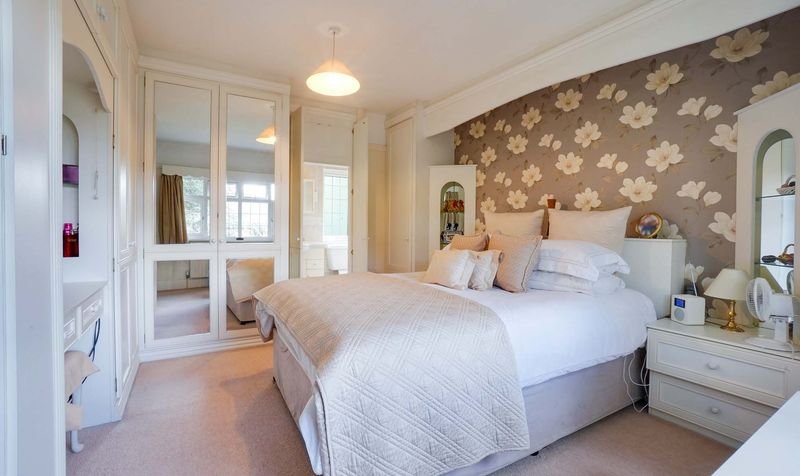 With double glazed window to the front elevation, a range of fitted wardrobes, mirrored wardrobes, dressing table with lighting and drawers, inset ceiling spotlights, radiator, concealed entrance to en suite.