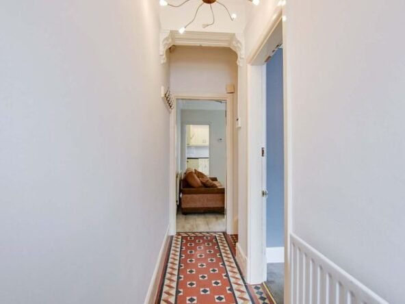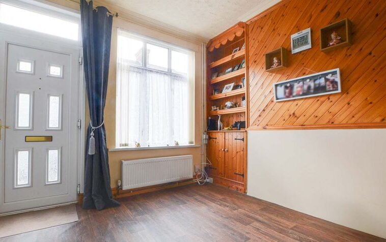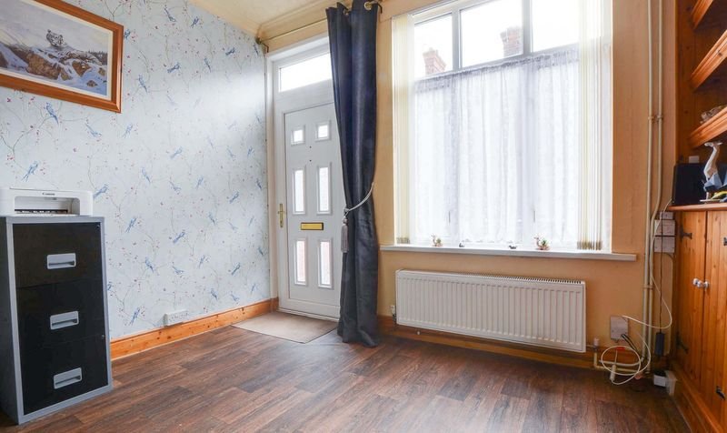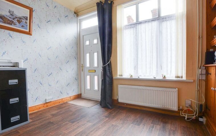 With double glazed window and door to the front elevation, built-in cupboard and shelving, wood effect floor, stairs to first floor, radiator.