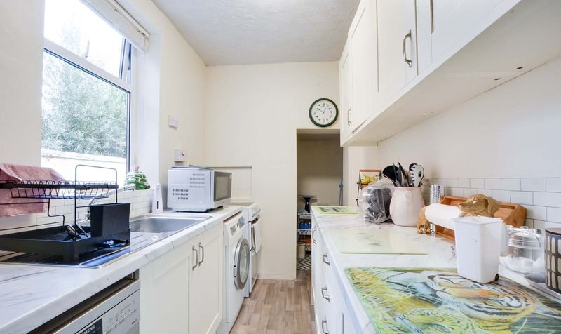 With double glazed window to the side elevation, a range of wall and base units with work surface over, stainless steel sink and drainer with mixer tap, cooker point, plumbing for washing machine, wall mounted boiler, alcove leading to a dry store area.