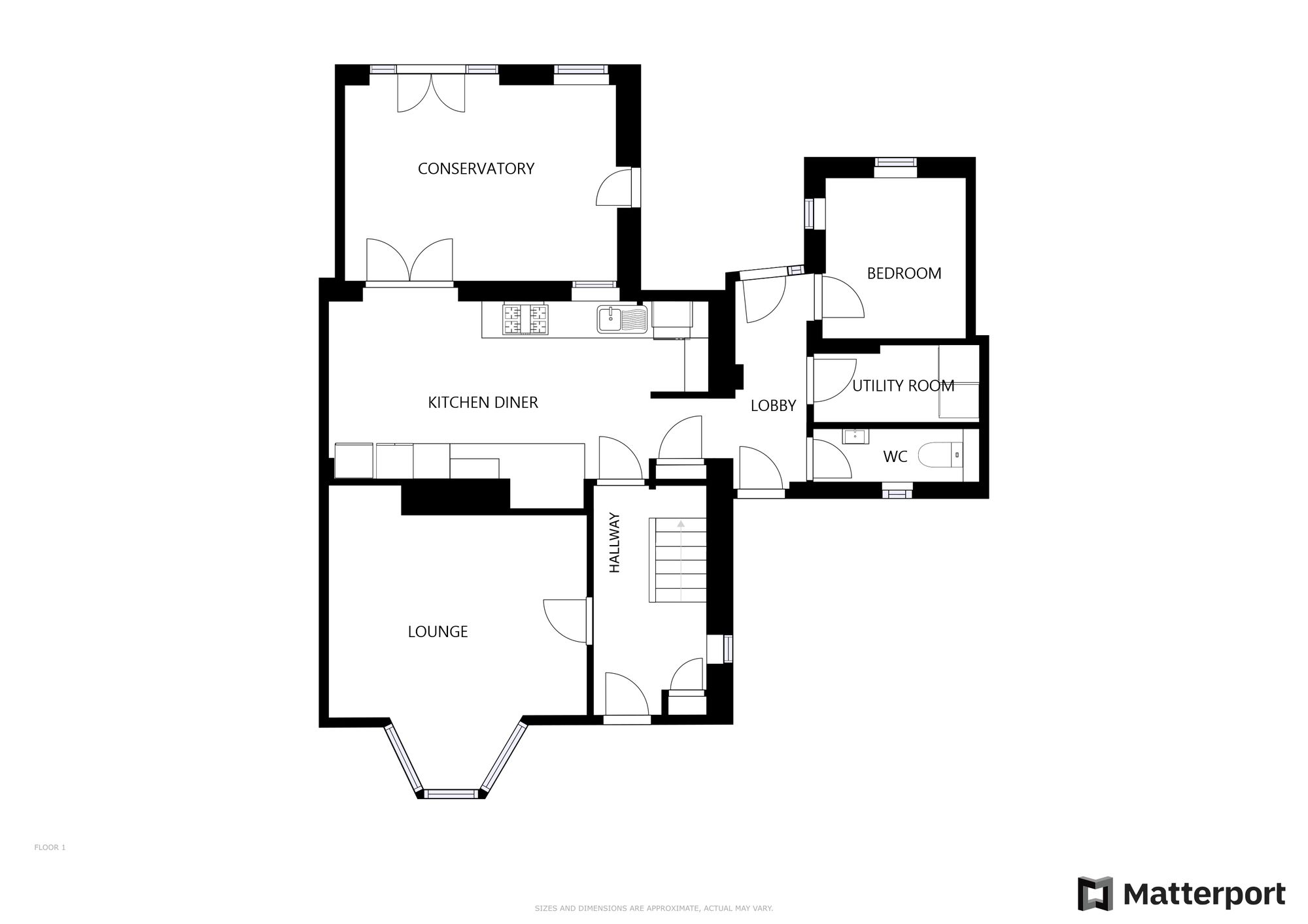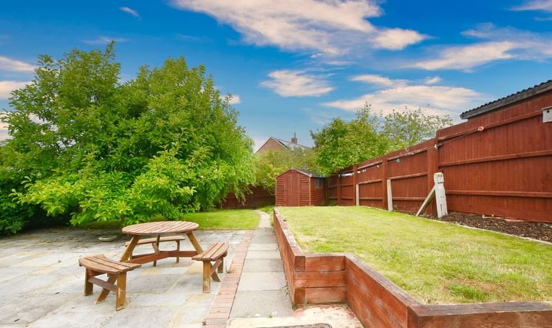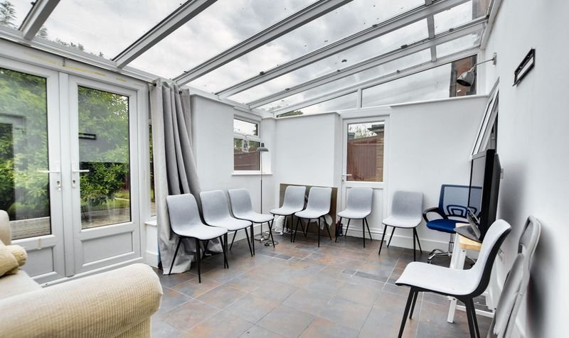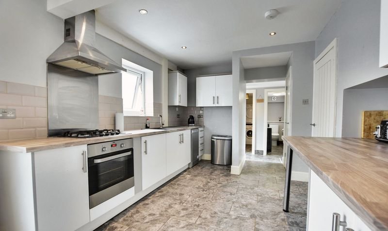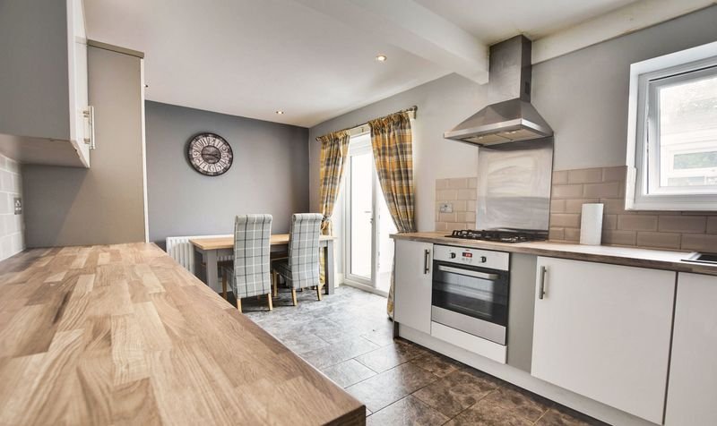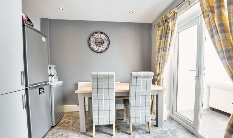 With double glazed window to the rear elevation, double glazed French doors to the rear elevation, tiled floor, part tiled walls, wall and base units with work surface over, sink and drainer, integrated oven and hob with extractor hood over, space for dishwasher, space for fridge freezer, built-in storage cupboard, radiator.