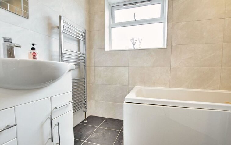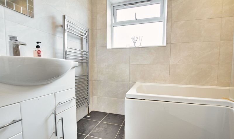 With double glazed window to the rear elevation, tiled floor, tiled walls, bath with shower over and shower screen, low-level WC, wash hand basin with storage below, towel rail/radiator.