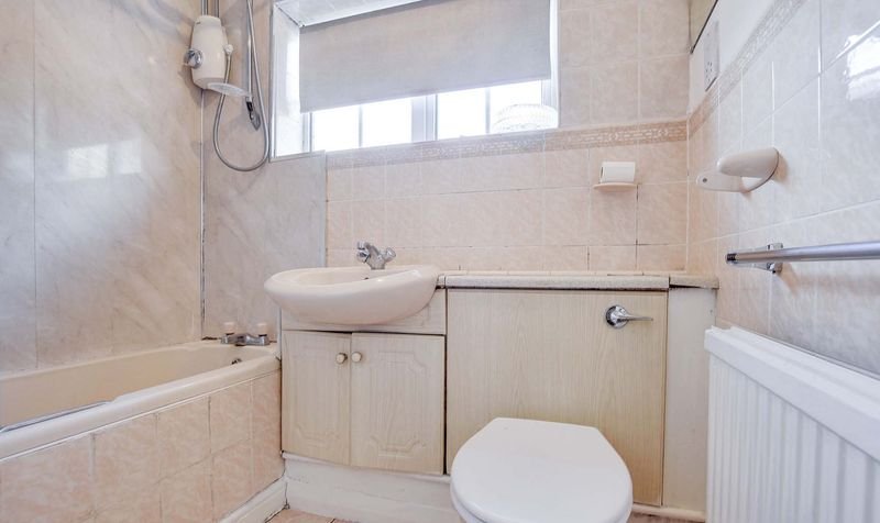 With double glazed window to the side elevation, tiled floor, part tiled walls, bath with electric shower over, wash hand basin with storage below, low-level WC, radiator.