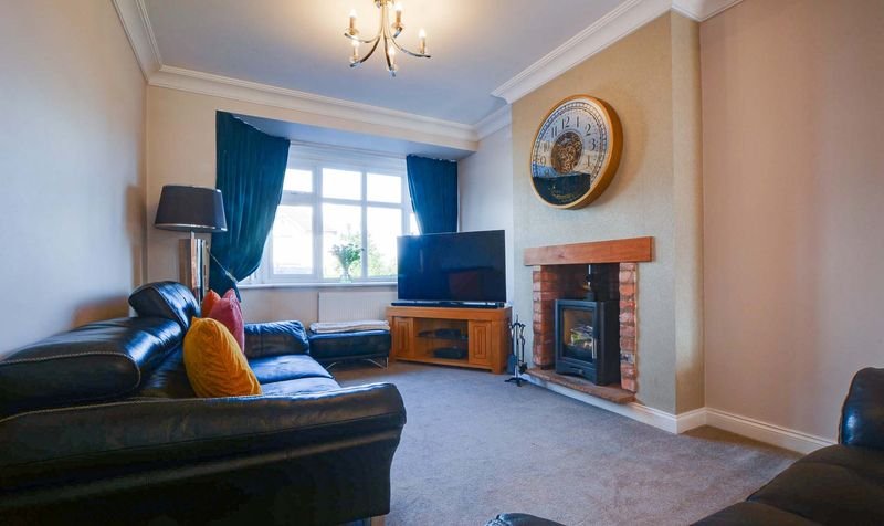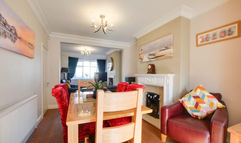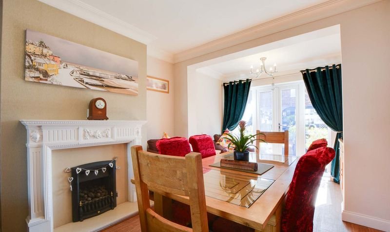 Measurement into bay window. A spacious through lounge diner with double glazed bay window to the front elevation, double glazed French doors to the rear elevation, chimney breast with a wood burning stove, surround and hearth, ceiling coving, further living flame gas fire with marble surround and hearth, two radiators.