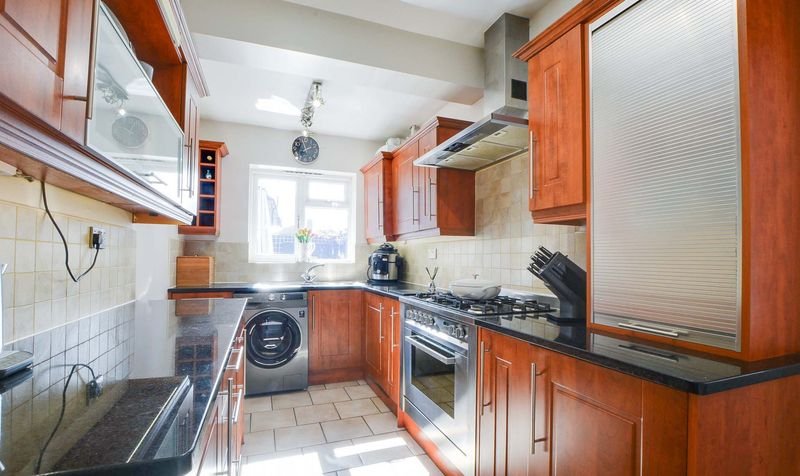 The entrance hall leads into a spacious through lounge diner, featuring a bay window to the front and French doors opening onto the garden, providing plenty of natural light. The extended fitted kitchen is equipped with a range of units, solid granite worktops and an integrated dishwasher.