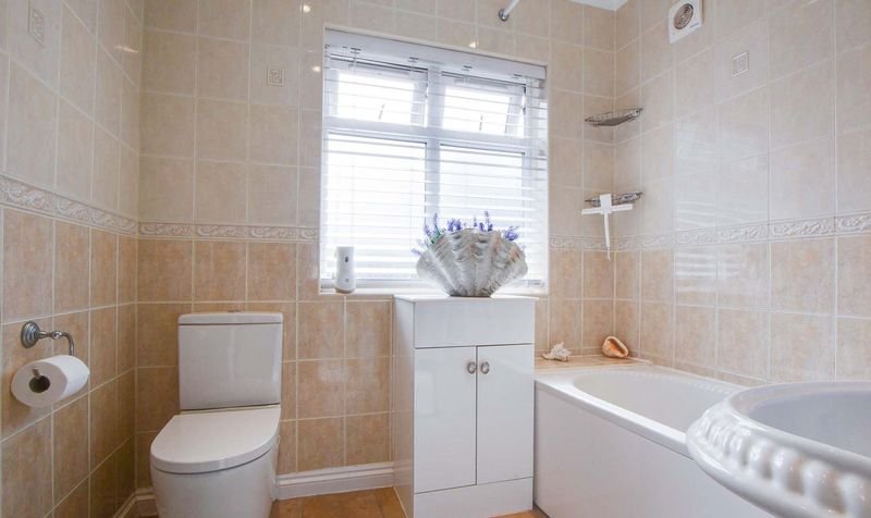 With double glazed window to the rear elevation, bath with mixer shower tap, low-level WC, wash hand basin, storage cupboard, tiled walls, tiled floor, chrome ladder towel rail/radiator.